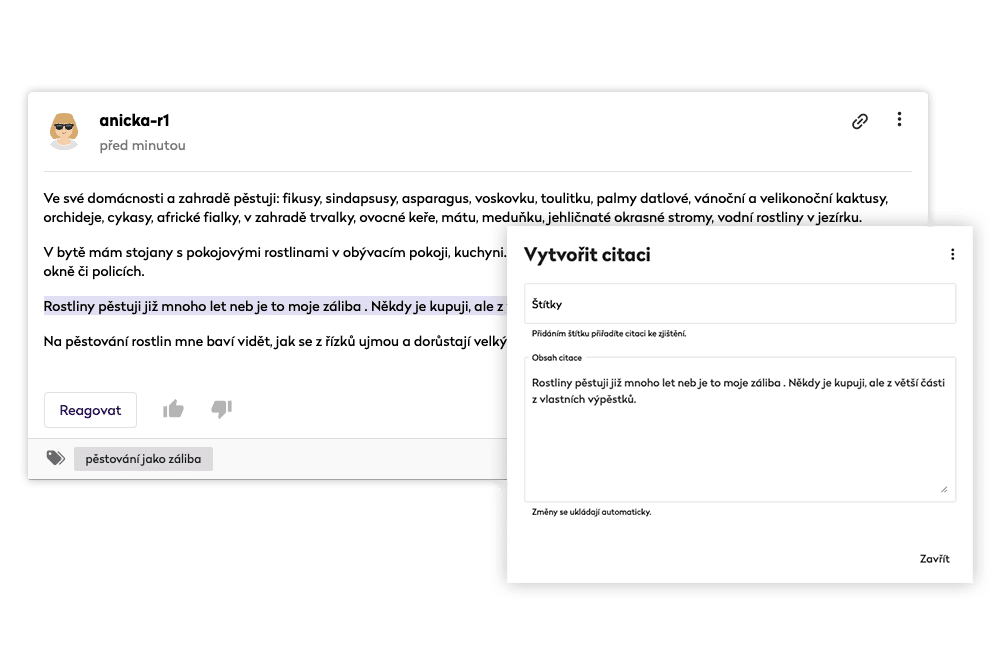 Výpovědi respondentů nemusíte přepisovat. Pouze si zvýrazníte citace, které jsou zajímavé, a díky štítkům si je přehledně zorganizujete.
