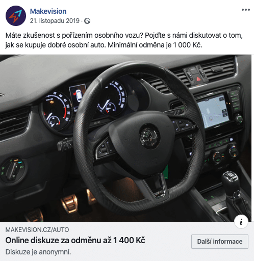 - Výše odměny – přestože lidé nediskutují pouze pro peníze (ale také protože chtějí být vyslyšení, rádi radí, chtějí pomoct, …), čím vyšší je finanční odměna, tím lépe. Nejčastěji se pohybujeme v rozmezí 800 až 1 400 Kč za více než týdenní diskuzi.